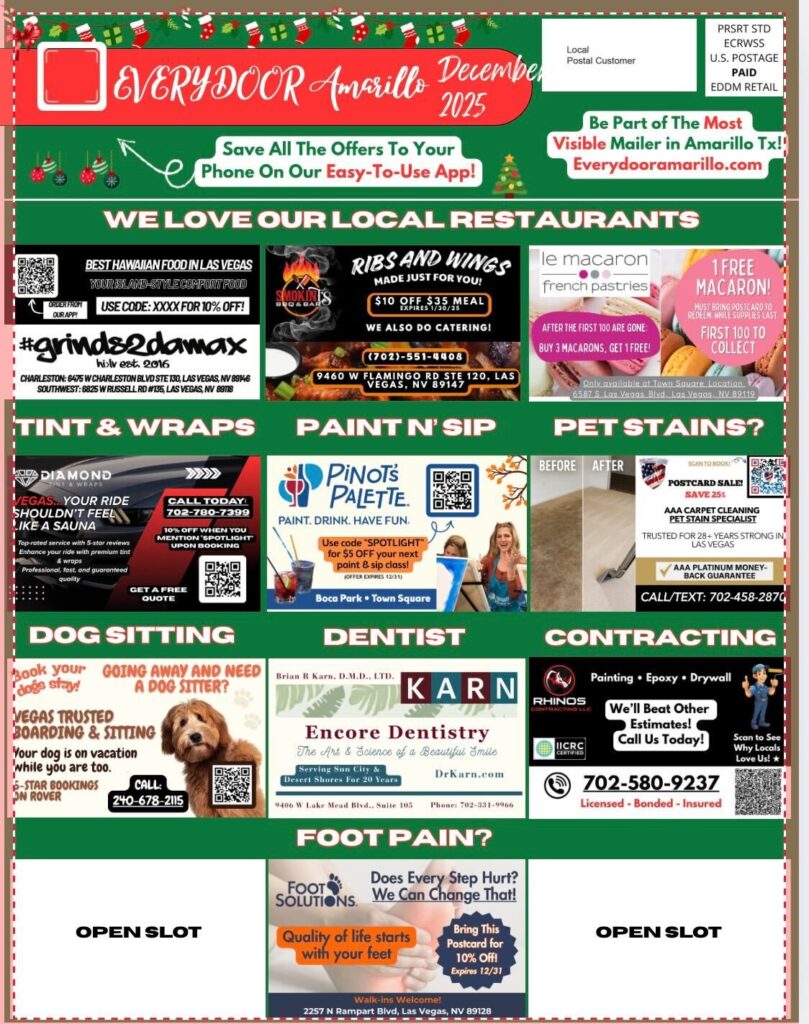 Everydoor Amarillo is a done-for-you direct-mail and digital advertising platform built exclusively for Everydoor Amarillo businesses. We combine a high-quality 8.5×11 postcard mailed to 5,000+ homes every month with a growing digital app full of local offers — making it easier than ever for locals to discover and support businesses like yours.